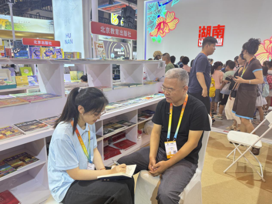 博览会上,北京印刷学院经济管理学院巴渝文心·阅行两江实践队对北京教育出版社副总编吕心鹏进行现场采访。在访谈中,吕心鹏就出版社情况为实践队员系统地展开介绍,实践队成员围绕教育出版的前沿动态并结合专业所学展开交流。