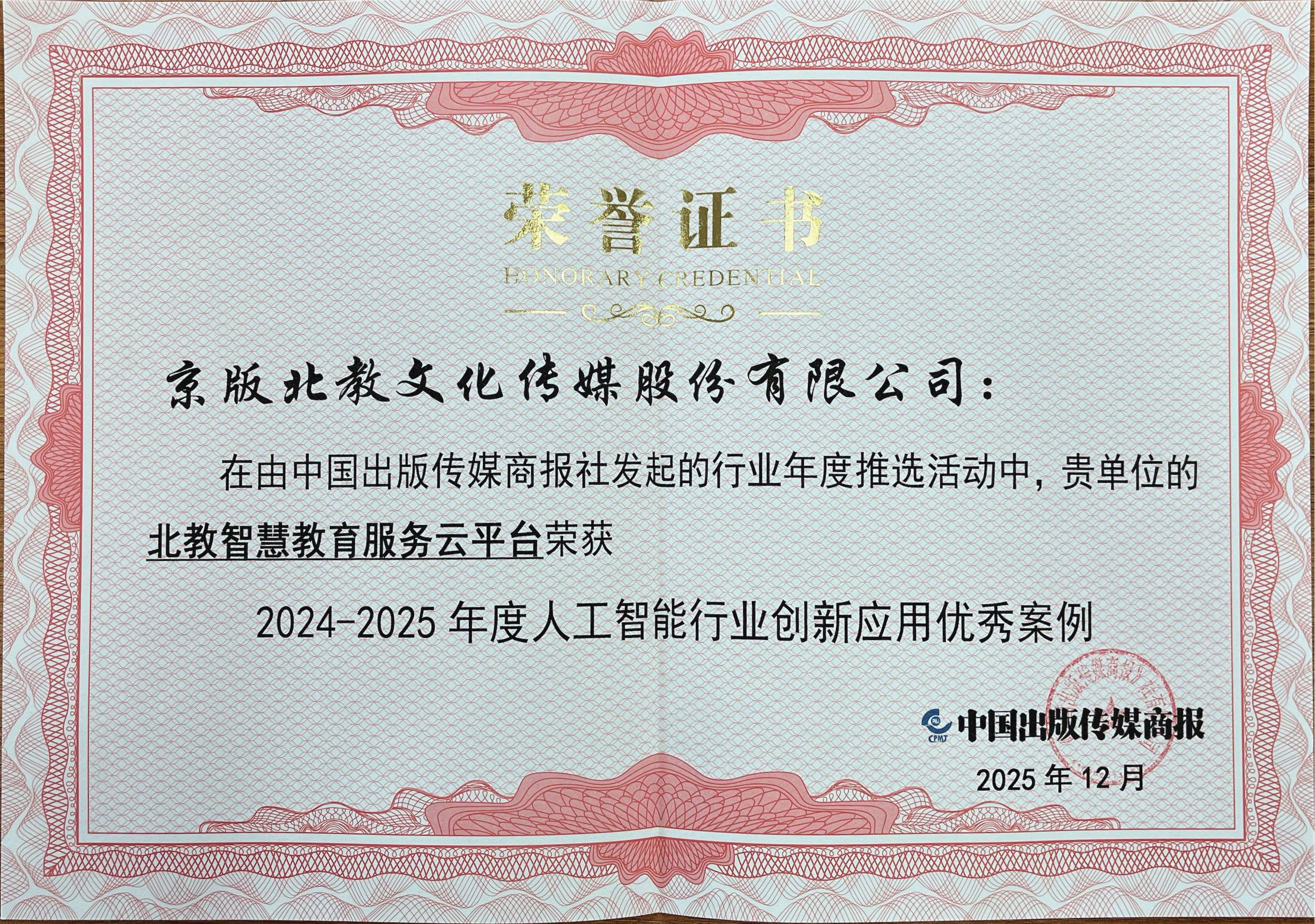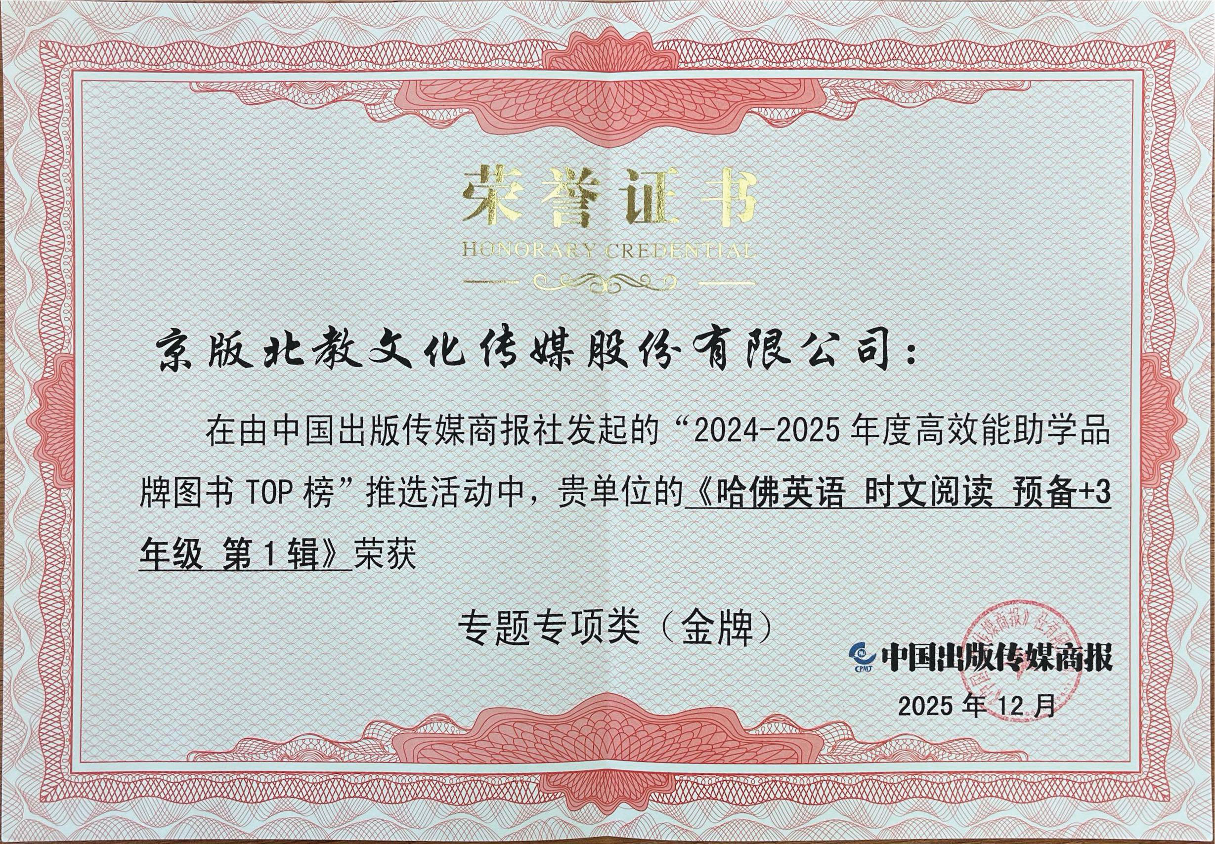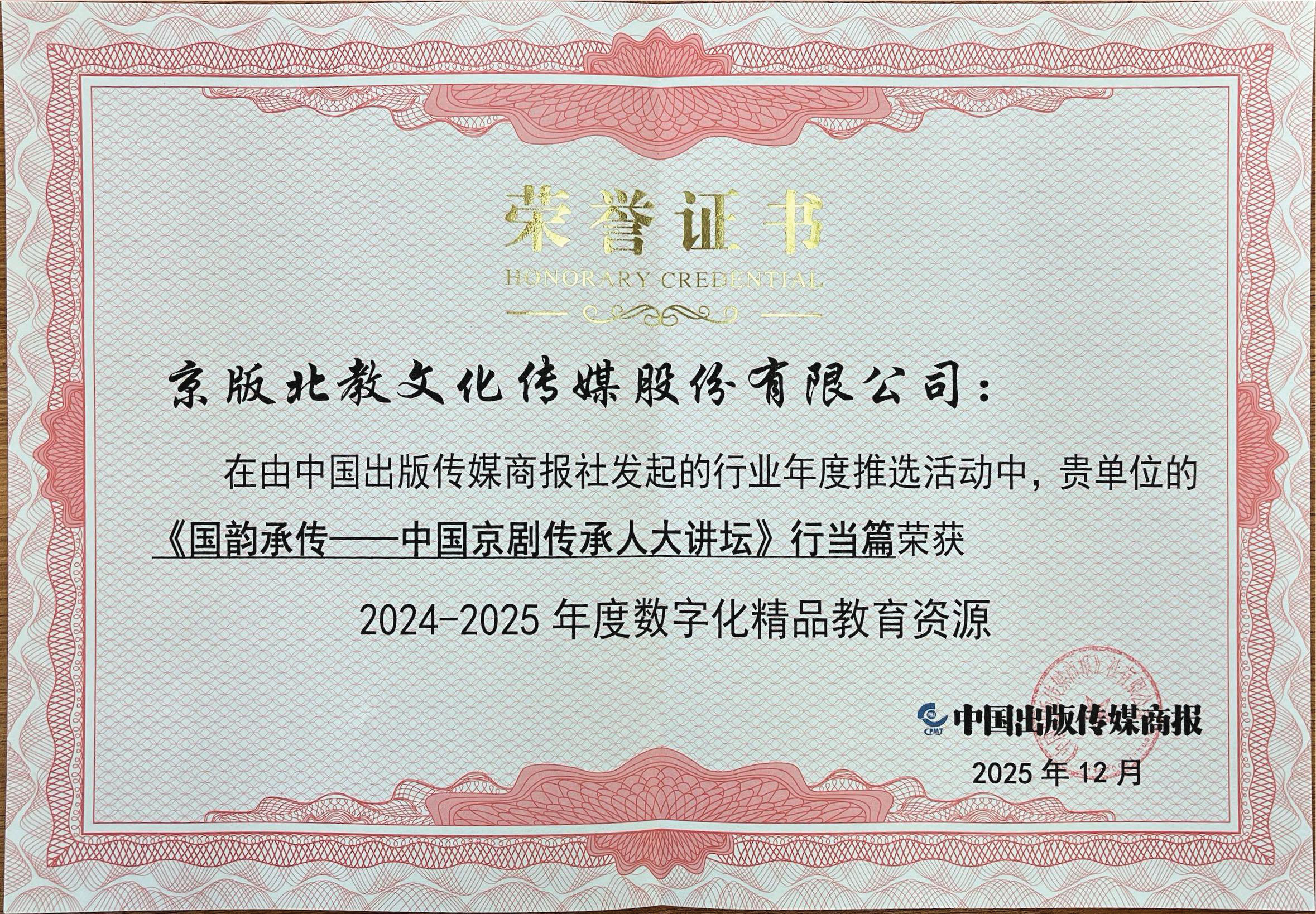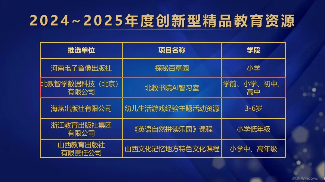 其中《国韵承传——中国京剧传承人大讲坛》行当篇获“2024~2025年度数字化精品教育资源”;“北教智慧教育服务云平台”获“2024~2025年度人工智能行业创新应用优秀案例”;《哈佛英语 时文阅读 预备+3年级 第1辑》获 “2024~2025年度高效能助学品牌图书TOP榜·专题专项类(金牌)”;北教传媒公司旗下子公司北教智学“北教书院AI智习室”获“2024~2025年度创新型精品教育资源”。